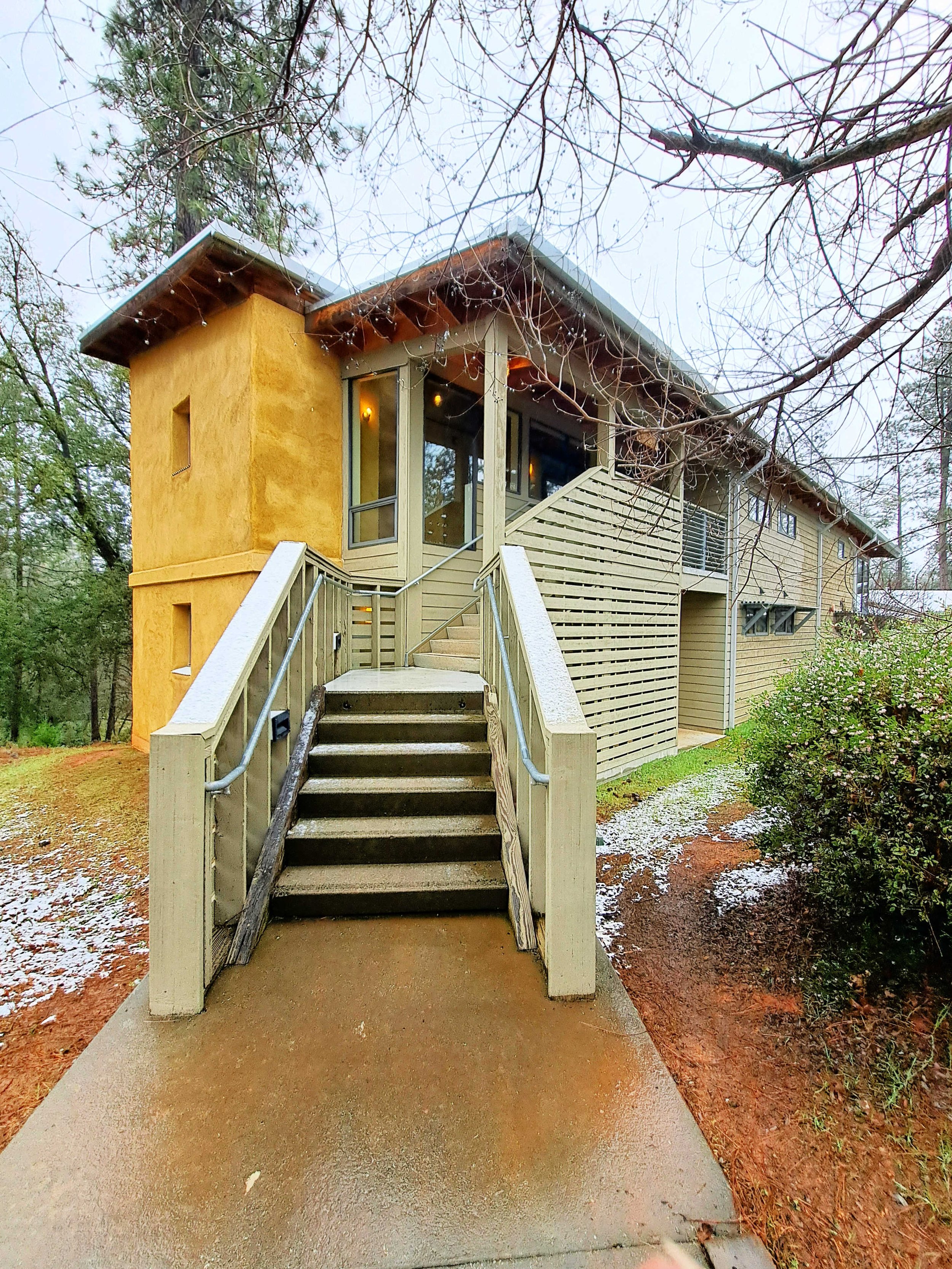 Oak Lodge is our most energy-efficient and structurally interesting building. The bedrooms are on one wing in a two-story building, while the conference rooms, kitchenette, and porch are all on a single-story level in another wing of the building. Oak Lodge features straw-bale walls, radiant floor heating, and energy-efficient swamp cooling, which provides welcome relief from the heat during warm summers.